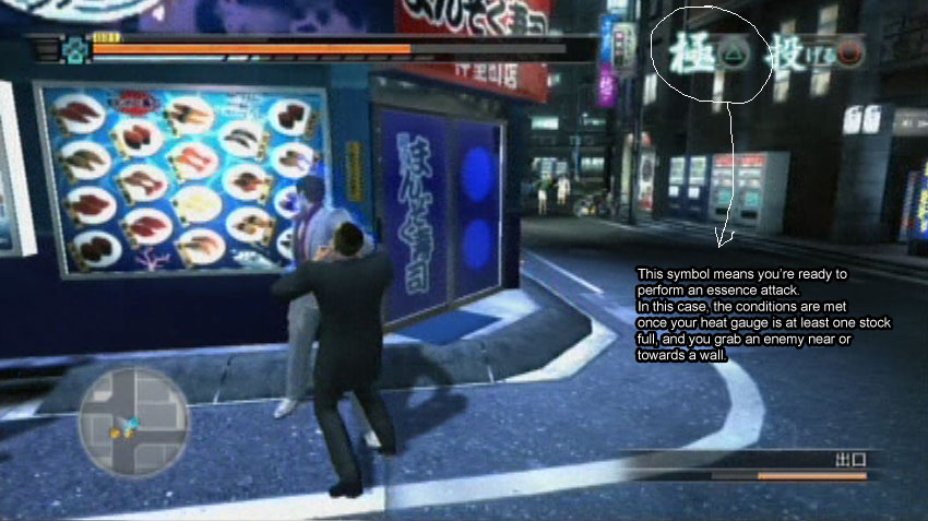 Every essence move requires different conditions to be met, but ultimately all of them are performed by pressing the /\ button. For example, the first essence move the game teaches you during tutorial requires you to grab an enemy (O button) near a wall and then press the /\ button. As long as you’re not near a wall, you’ll not be able to perform this essence move even if your heat gauge is full. Other essence moves may require you to grab an enemy near a car, bench, street lamp, etc, so you get the idea you have to interact with the environment. There’re even some move that require you to be drunk (by purchasing/drinking alcohol) XD!